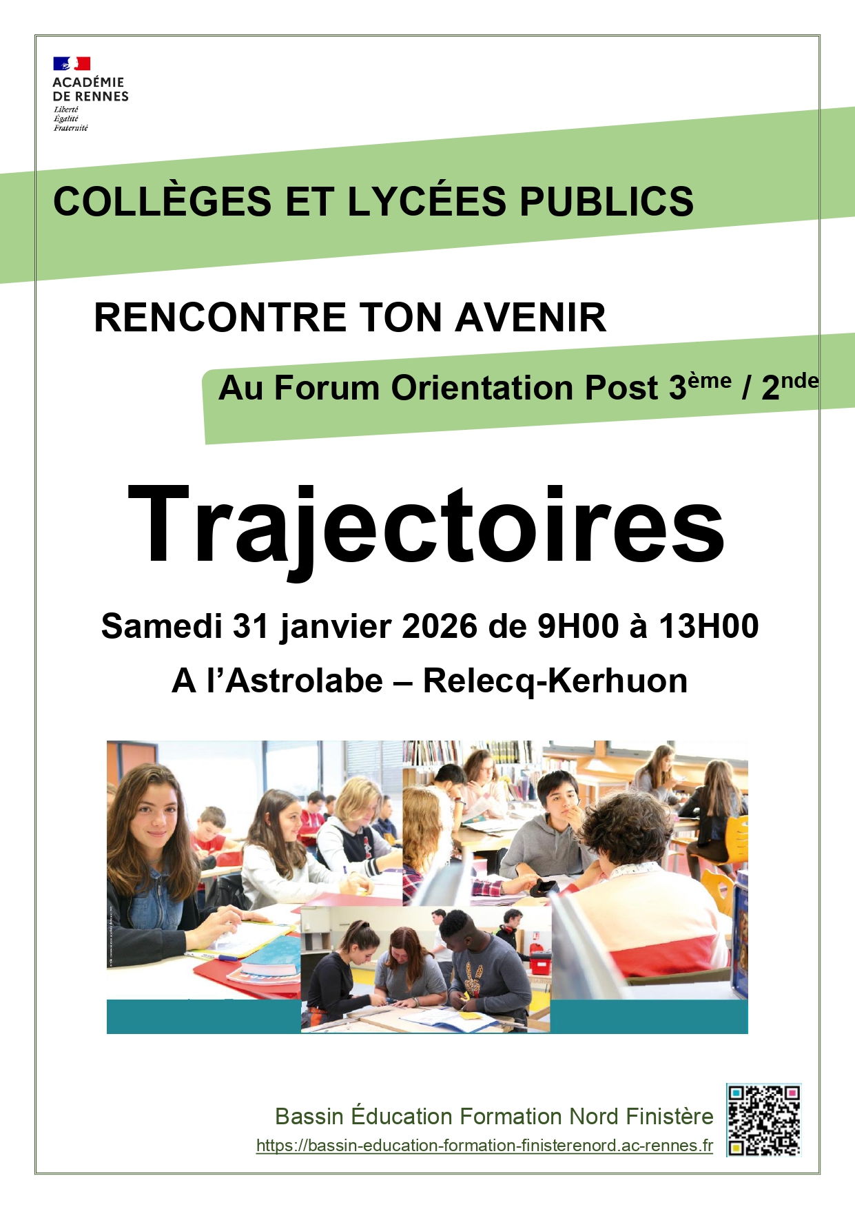 Les établissements publics, les Centres d’Information et d’Orientation de Brest et de Landerneau organisent, le samedi 31 janvier 2026 de 9h00 à 13h00, le Forum du Post 3ème et Post 2nde à l’Astrolabe au Relecq-Kerhuon.